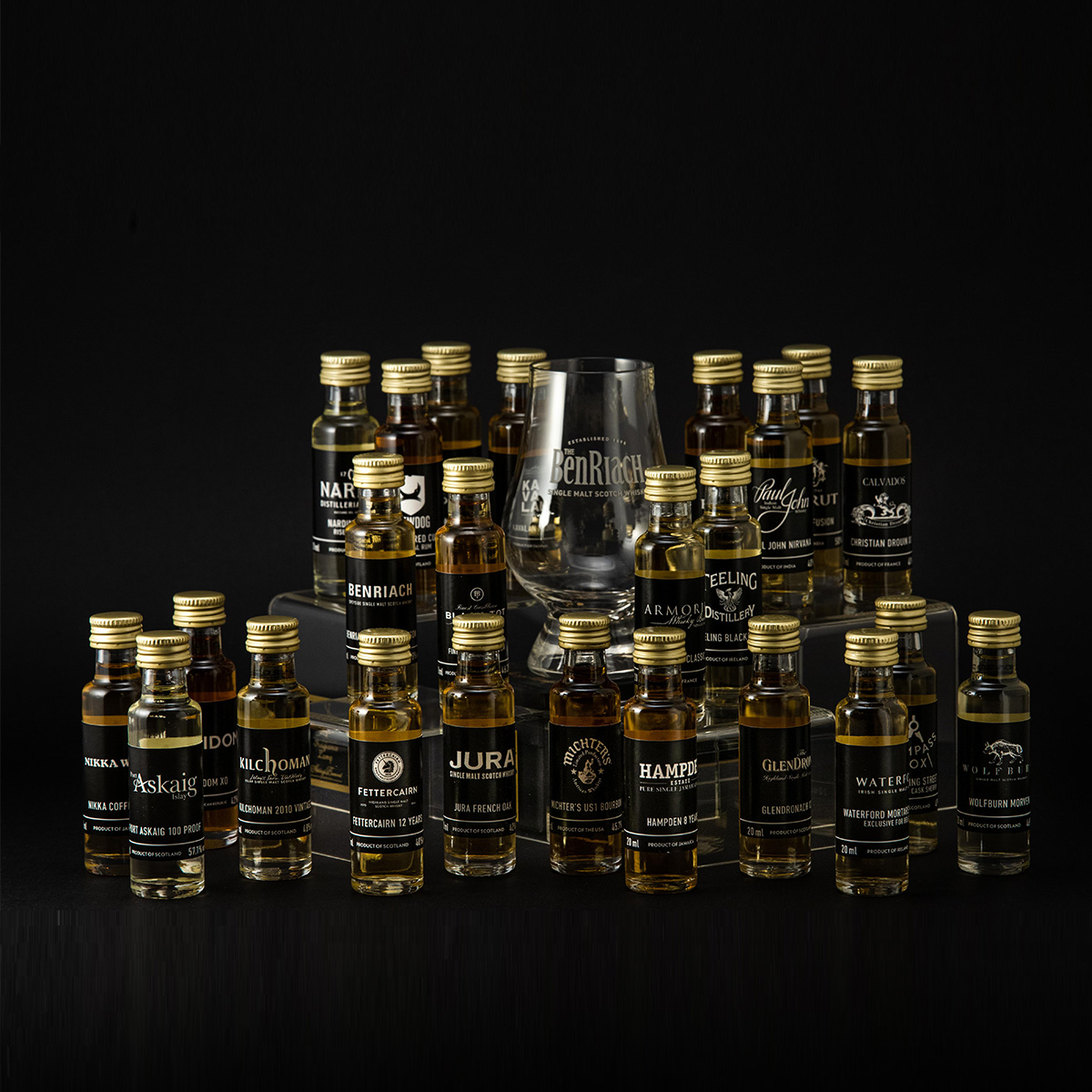 This tasting box contains 24 x 2cl rums, whiskys, cognacs, bourbon, grappa and a tasting glass